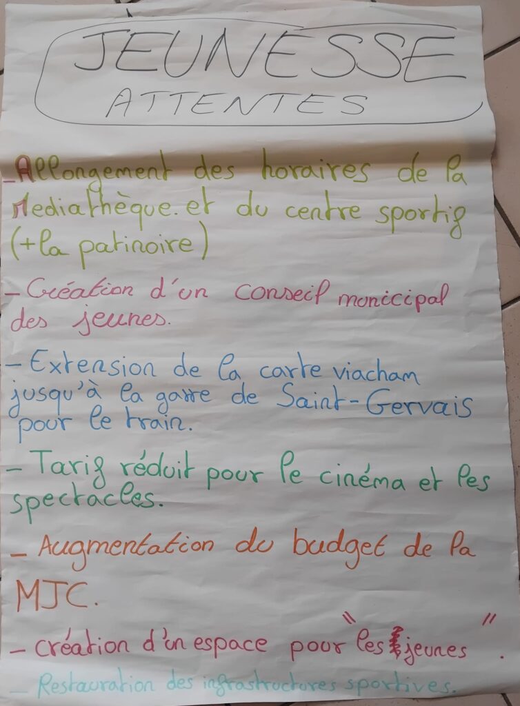 Notre réunion publique du 19 mars a comblé ce vide. Trois jeunes de Chamonix, âgés d’environ 15 ans sont venus pour nous rencontrer et nous faire part de leurs attentes, d’abord en les exprimant sur une affiche puis en les explicitant lors de nos échanges. Tous les adultes présents ont été impressionnés par leur maturité, leur motivation à participer à la vie citoyenne, leur capacité à argumenter leurs demandes, leur espoir d’être pris en compte. Le Projet Citoyen, c’est ça !